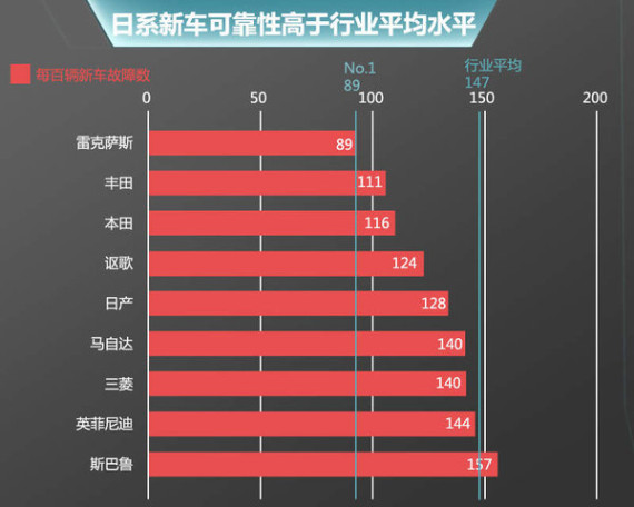 在很多消费者的认识里,日系品牌车型相对于其他品牌车型通常具备高燃油经济性以及舒适度等优势,但对于这些车型而言,“不安全”、“不可靠”被称为是一大“硬伤”,那么事实是否真是如此呢?针对这一问题,媒体从美国权威调查机构J.D. Power and Associates获悉:日系9品牌新车质量可靠性整体高于行业平均水平,其中雷克萨斯凭借每百辆车故障次数仅89次继续领跑新车质量可靠性排行榜,丰田、本田、日产以及三菱4品牌排名出现不同幅度上升,数三菱上升幅度最大,其余4品牌则均出现下滑。