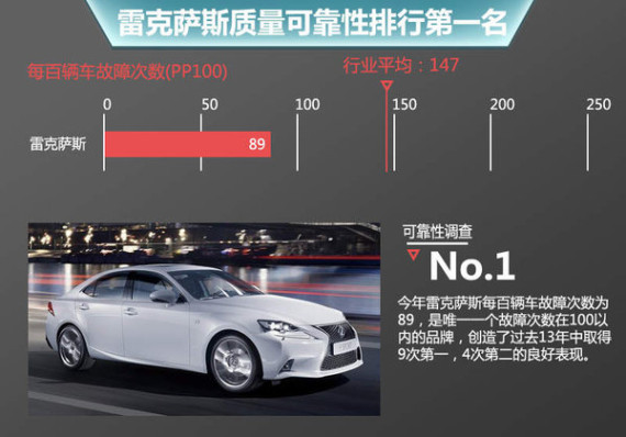 在今年的质量可靠性评比中,雷克萨斯每百辆车故障次数为89,虽然相对去年的68次有所上升,但仍是唯一一个故障次数在100以内的品牌,创造了过去13年中取得9次第一,4次第二的良好表现。质量可靠性自然也带来了强劲的市场表现,2014年雷克萨斯全球销量保持了10%的增长,在日系品牌中,雷克萨斯销量增幅十分稳定。