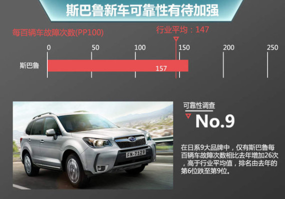 目前斯巴鲁在美销售的车型包括BRZ、翼豹、WRX、力狮、森林人、傲虎、XV及XV混动共八款车型。凭借8款车型的支撑,斯巴鲁2014年在美国销量突破50万台,连续7年保持增长,提前完成此前设定目标。不过,斯巴鲁在新车可靠性方面却有待提升,相比2014年131次的每百辆车故障次数(低于行业平均水平),今年其在日系9品牌车型中是唯一一家每百辆车故障次数高于行业平均水平的车企,达到157次,在9家品牌中排名垫底。