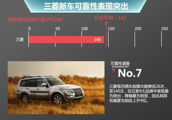 从数据上来看,今年整个行业新车质量可靠性平均值达到147次,去年则是133次,可见整体每百辆车故障次数在上升。尽管三菱汽车今年在日系品牌中排名并不算靠前,但从去年的每百辆车故障次数166次(高于平均水平)降低至今年的140次(低于平均水平),新车可靠性实现质的提升。
