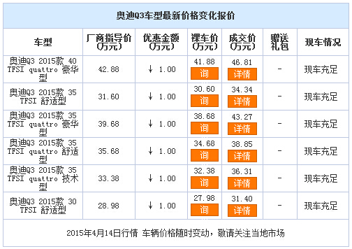 新浪银川汽车讯 近日,编辑从宁夏德胜奥立升奥迪4S店了解到,4月购车提前享受车展政策,Q3现购车优惠1万元现金,感兴趣的朋友可到店咨询或电话垂询。