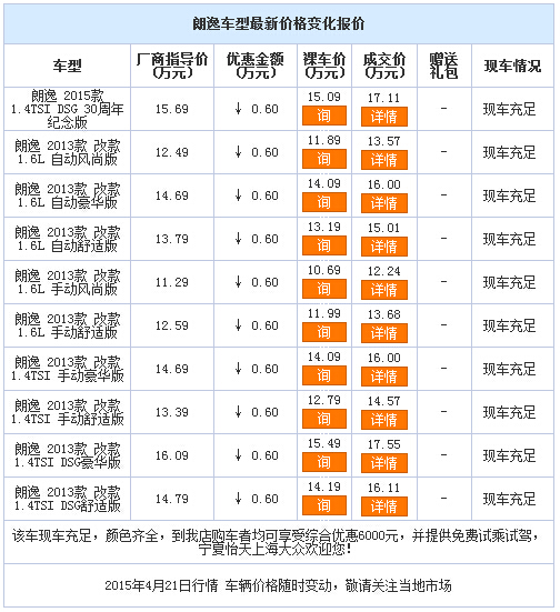 新浪银川汽车讯 近日,编辑从上海大众宁夏怡天4S店了解到,朗逸 (配置|询价)现车销售,颜色可选,目前购车部分车型可优惠0.60万元,感兴趣的朋友可以到店咨询或电话垂询。