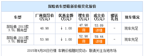 新浪银川汽车讯 近日,编辑从长安福特宁夏福立升4S店了解到,探险者现车销售,颜色可选,目前购车部分车型可优惠1.00万元,感兴趣的朋友可以到店咨询或电话垂询。