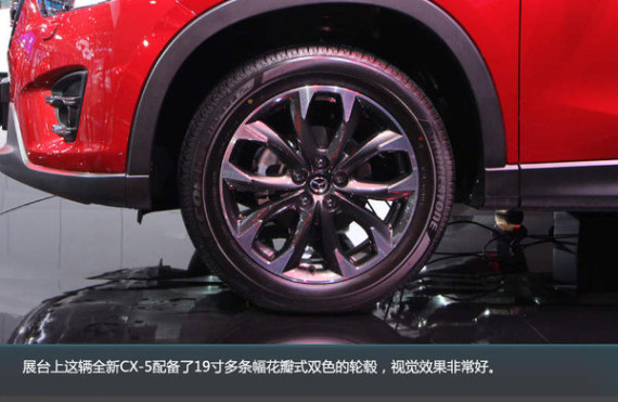 展台上这辆全新CX-5配备了19寸多条幅花瓣式双色的轮毂,视觉效果非常好。