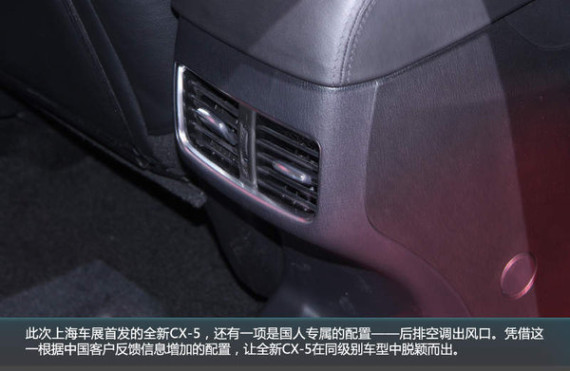 此次上海车展首发的全新CX-5,还有一项是国人专属的配置——后排空调出风口。凭借这一根据中国客户反馈信息增加的配置,让全新CX-5在同级别车型中脱颖而出。