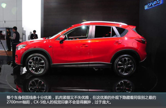 整个车身侧面线条十分优美,肌肉紧绷又不失优雅,在这优美的外观下隐藏着同级别之最的2700mm轴距,CX-5给人的视觉印象不会显得臃肿,过于庞大。