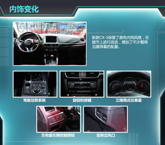 新款CX-5保留了原有的内饰风格,在细节上进行了改进,增加不少看得见摸得着的配置。