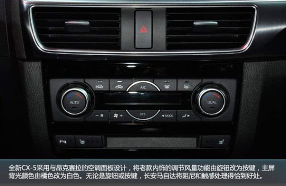 全新CX-5采用与昂克赛拉的空调面板设计,将老款内饰的调节风量功能由旋钮改为按键,主屏背光颜色由橘色改为白色。无论是旋钮或按键,长安马自达将阻尼和触感处理得恰到好处。