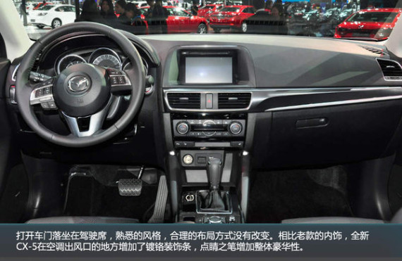 打开车门落坐在驾驶席,熟悉的风格,合理的布局方式没有改变。相比老款的内饰,全新CX-5在空调出风口的地方增加了镀铬装饰条,点睛之笔增加整体豪华性。