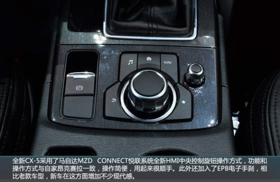 全新CX-5采用了马自达MZD CONNECT悦联系统全新HMI中央控制旋钮操作方式,功能和操作方式与自家昂克赛拉一致,操作简便,用起来很顺手。此外还加入了EPB电子手刹,相比老款车型,新车在这方面增加不少现代感。