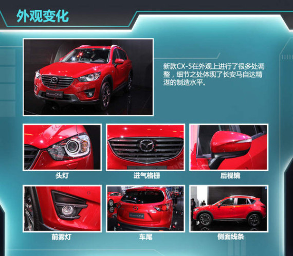 2015年上海国际车展,长安马自达新款CX-5 (配置|询价)正式亮相。新车在外观上全面进化,并根据中国消费者的意见反馈,增加了很多科技配置。据悉,全新长安马自达CX-5会在今年第二季度末期正式上市。