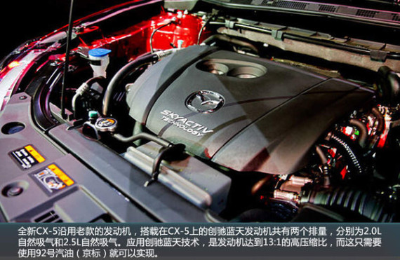 全新CX-5沿用老款的发动机共有两个排量,分别为2.0L自然吸气和2.5L自然吸气。应用创驰蓝天技术,使发动机达到13:1的高压缩比,而这只需要使用92号汽油(京标)就可以实现。