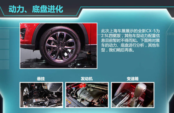 此次上海车展展示的全新CX-5为2.5L四驱版,其他车型动力配置信息目前暂时不得而知。下面将对展车的动力、底盘进行分析。