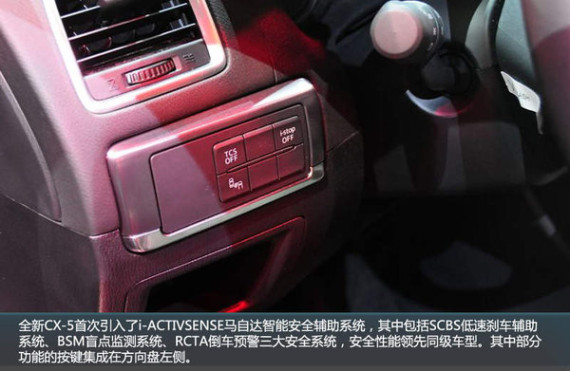 全新CX-5首次引入了i-ACTIVSENSE马自达智能安全辅助系统,其中包括SCBS低速刹车辅助系统、BSM盲点监测系统、RCTA倒车预警三大安全系统,安全性能领先同级车型。其中部分功能的按键集成在方向盘左侧。