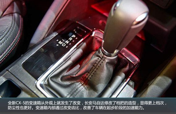 全新CX-5的变速箱从外观上就发生了改变,长安马自达修改了档把的造型,显得更上档次,防尘性也更好。变速箱内部通过改变齿比,改善了车辆在起步阶段的加速能力。