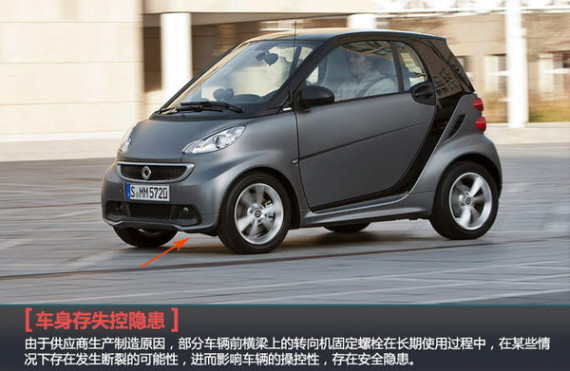 据了解,此次召回smart fortwo原因是车身存失控隐患。由于供应商生产制造原因,部分车辆前横梁上的转向机固定螺栓在长期使用过程中,在某些情况下存在发生断裂的可能性,进而影响车辆的操控性,存在安全隐患。