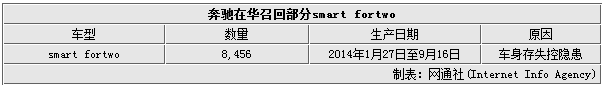 smart是奔驰旗下主打年轻时尚的一款微型小车,在中国的城市青年群体中拥有一定的影响力。日前,国家质检总局缺陷产品管理中心透露,因车辆存在失控隐患,梅赛德斯-奔驰公司将自2015年5月8日起,在华召回部分2014至2015款进口smart fortwo汽车。此项计划将在中国大陆地区涉及8,456辆车。