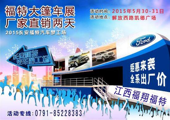 长安福特汽车—梦工场,一年等一回!购车良机已现 ,5月30-31日长安福特梦工场即将登陆南昌市解放西路凯德广场,江西福翔福特将携全系车型闪亮登场。现场不仅有精彩表演,试乘翼虎,体验交叉轴,带给您最具有感官冲击力的现场表演,更有全新刺激体验,参与互动还能赢取神秘大奖,让您领略一场科技、工艺、节能、时尚为一体的“汽车梦工场盛宴”之外更能享受一次超级钜惠时光!
