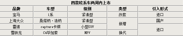 中国汽车市场虽然进入了微增长时代,但各大汽车制造商已久保持着高昂的斗志,其不断将旗下产品导入中国市场,并希望通过丰富产品线争取更高的市场份额。近日,媒体盘点了两周内即将在华上市的四款欧系车型,其中大多数为进口车型,如宝马新1系、雷诺卡缤。而这些车型多数为入门级或者价格较低的进口车,在车市转型买方市场后车企更倾向于针对最能打动消费者的价格因素下功夫。