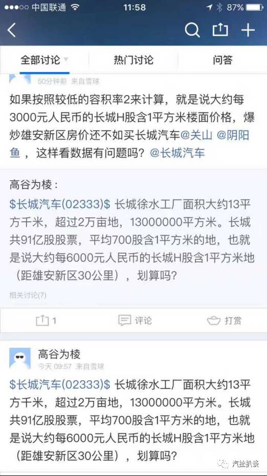 有网友甚至经过细致的换算得出一个结论——买长城汽车的H股,相当于以3000块钱/平米的价格购买雄安新区附近的土地,这对于已经炒到了3万一平的雄安新区地价来说,已经是冰天雪地360度裸体大甩卖价了。