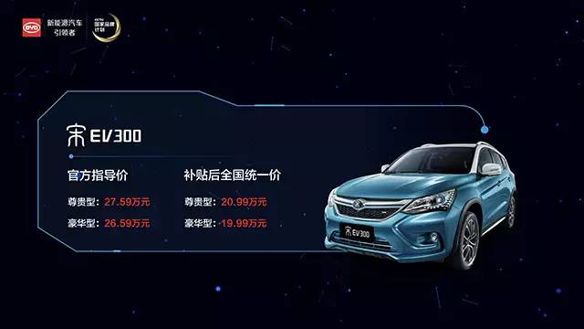 宋EV300补贴后全国统一价为19.99万元—20.99万元。宋EV300是比亚迪首款纯电动SUV,搭载永磁同步高效率高转速电机,最大功率160千瓦,最大扭矩310牛•米,百公里加速达8.9秒。目前,全球能够跑进9秒俱乐部的纯电SUV只有两款,宋EV300就是其中一款。