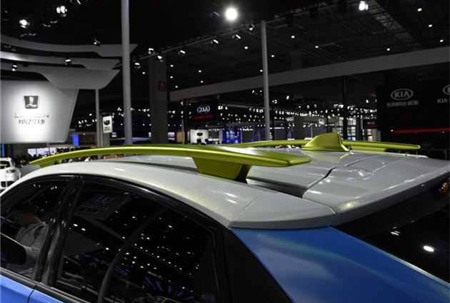 银光绿色行李车架及其抢眼,但造型还过于概念,并不具有实用性,白色车顶为整车外观增添不少萌气。