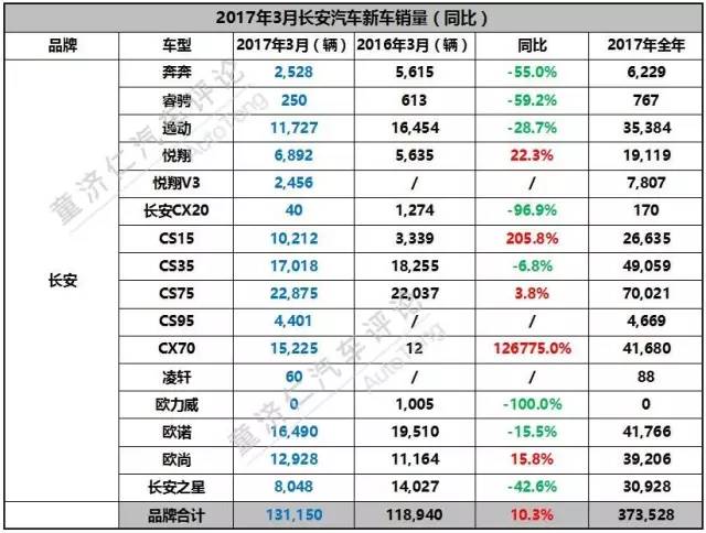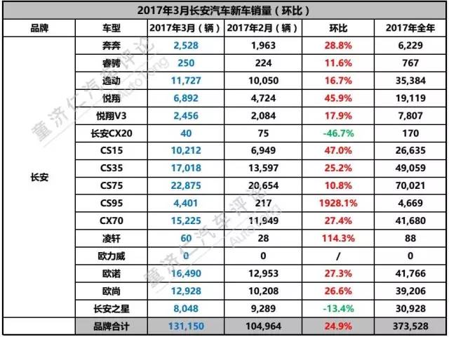 2017年3月,长安汽车共销售新车131,150辆,同比增长10.3%,环比增长24.9%,排名国内自主乘用车企第二名。
