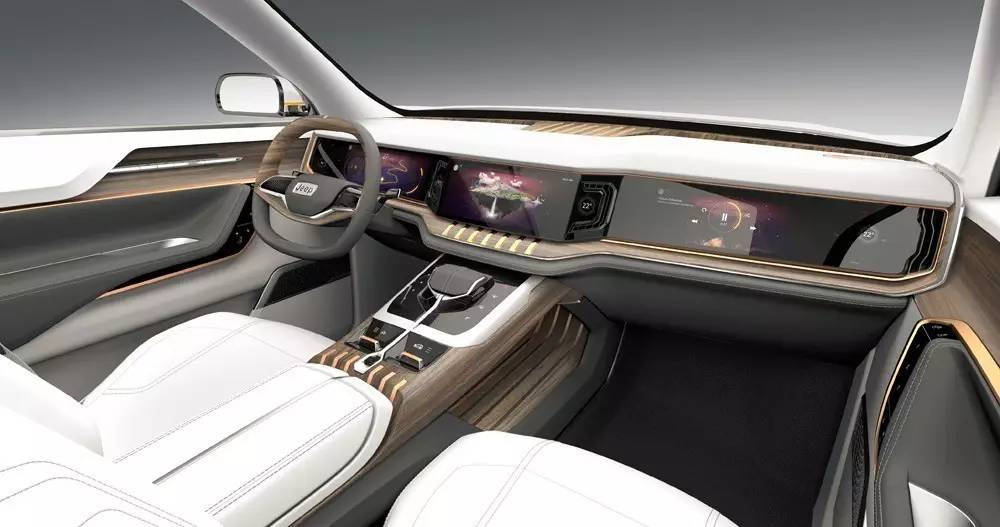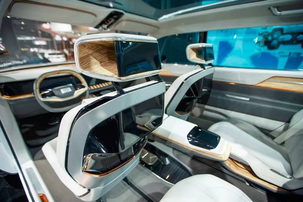 为此,在内饰设计上采用“悬浮”主题,仪表台的横向延伸,中央扶手的中空型设置,地板的透明化处理等细节带来了轻盈、灵巧和宽适的空间体验。铜色饰条和木材装饰,点缀在黑、银色内饰主体上,为冷峻的科技感带来了几分暖意。第一,第二排座椅背部都有双屏系统,提供后排乘客使用。第二排独立座椅还具备躺倒和翻转功能,以兼顾各种使用场合。