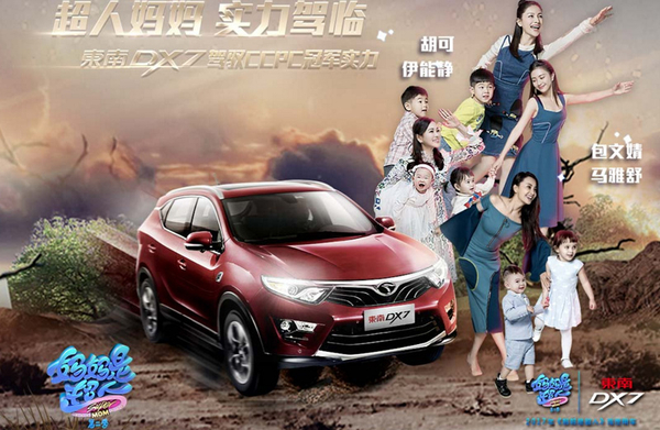 《妈妈是超人2》的指定用车是东南DX7。东南DX7是东南汽车联合意大利著名汽车设计公司宾尼法利纳打造的首款产品,也是东南汽车的首款量产SUV。2016年,东南汽车产值增长60%,营收产值破百亿,而明星车型——东南DX7连续四个月订单破万辆。