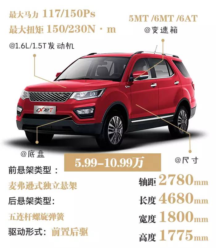 长安CX70在最新款上搭载了由长安英国研发中心研发的蓝芯BLURCORE1.5T发动机,最大功率150匹马力,峰值扭矩为230牛米,匹配来自爱信的6AT自动变速器,采用前置后驱的驱动方式,这套动力总成的升级,无疑地,比过往那套1.6L+5MT的好很多,对于这款中型7座SUV,加涡轮的动力更加好,再匹配6AT,买来家用更加合适。