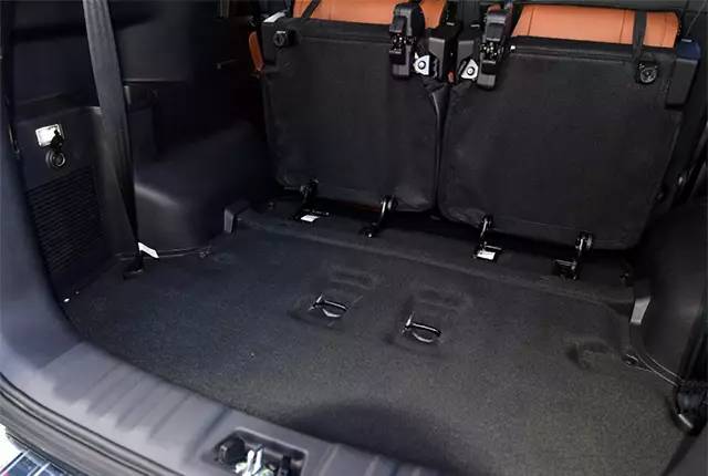 第三排放倒,翻折之后可获得一个更大更平整的后备箱空间,最大纵深达到870mm,最大宽度达到1380mm。