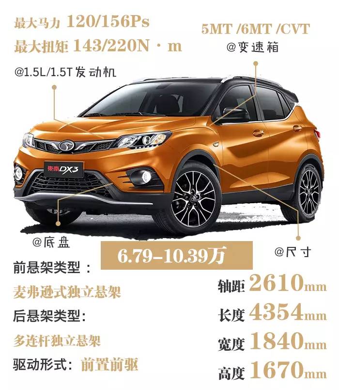 东南DX3在车身质量上比长安CX70轻了约100kg,如果只是城市代步,则考虑1.5L自然吸气版本,只匹配5挡手动变速器,如果常走高速,则推荐这款来自三菱的1.5T发动机,最大功率156匹马力,峰值扭矩为220牛米,与长安CX70相差不大,但由于车轻,东南DX3可以以更加轻快的姿态去驾驭,传动方面则匹配有6挡手动和CVT无级变速器(来自比利时邦奇)。