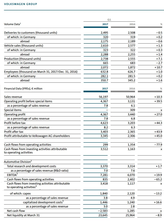 大众汽车集团CEO马蒂亚斯·穆伦(Matthias Mueller)在声明中表示:“我们在公司所有方面改善效率和生产率的努力得到了回报。”而首席财务官Frank Witter则指出:“上季度这些业绩数字代表着看得见摸得着的初步成效。”