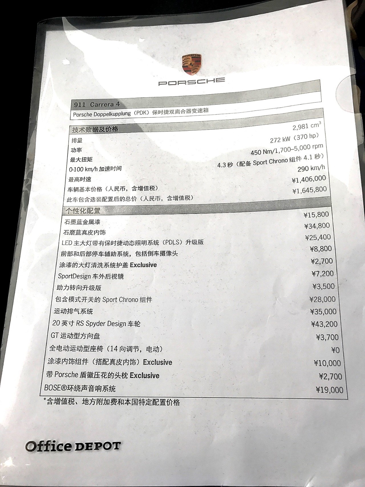 说到选装,再有就是选装件的价格实在是有点贵……比如给大灯清洗系统的保护盖涂个漆就要2700元,带保时捷标志的头枕也要2700元。我们这台911 Carrera 4的基本价格是140.6万元,选装完之后的价格为164.58万元。主要选了下面这些好东西。