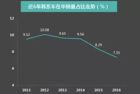 以北京现代和起亚为代表的韩系车销量下跌,也带动了韩系车市场份额的下滑。由2012年在华的10.10%跌倒了如今的4.6%。然而,这并不是一蹴而就的。