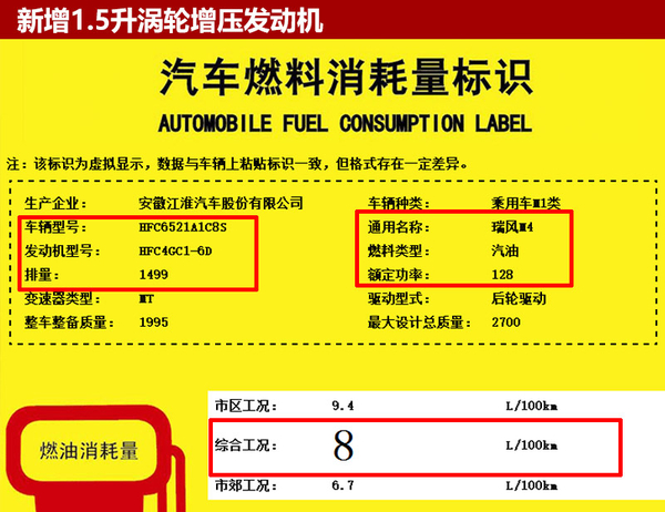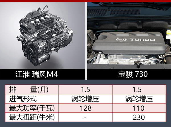 从国家工信部公布的信息可知,江淮瑞风M4将搭载一台型号为HFC4GC1-6D的1.5升涡轮增压发动机,额定功率128千瓦,百公里综合油耗为8升。同级别车型宝骏730所搭载的1.5T发动机最大功率为110千瓦,通过对比后可以看出,瑞风M4在最大功率上优于竞品车型。