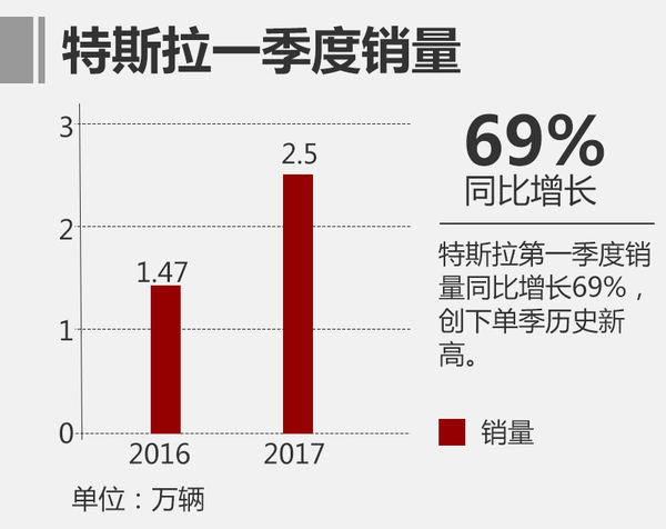 2017年一季度,特斯拉共交付2.5万辆Model S和Model X,创下单季度销量历史新高,同比增长69%。此外,特斯拉一季度总产能为25,418辆,高于去年同期的15,510辆。