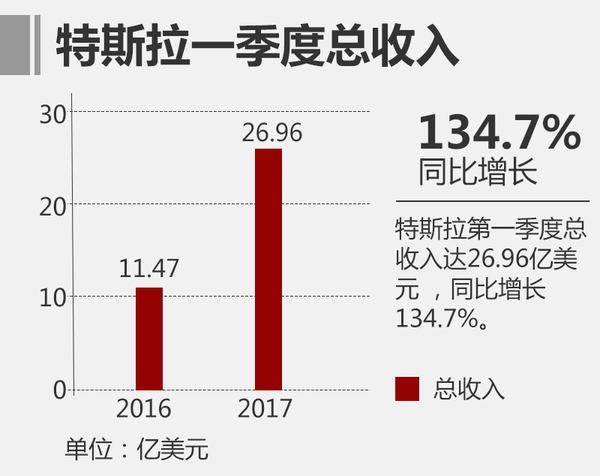美国电动汽车生产商特斯拉在5月3日美国股市收盘后,发布了截至3月31日的2017财年第一季度财报。网通社从路透社获悉,特斯拉今年一季度总收入为26.96亿美元,相比去年同期的11.47亿美元增长134.7%。