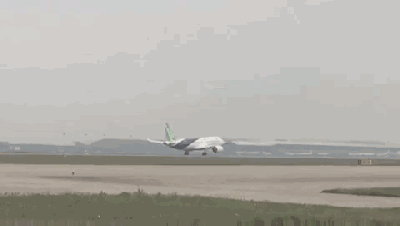 中国首架大型干线喷气式客机首飞!5月5日下午14点,这架名为“C919”的双发客机在上海浦东国际机场加速滑跑,在跑道三分之二处抬起前轮,随后主轮离地,这架由我国自主研发的大型客机离开地面,奔向万里云霄。