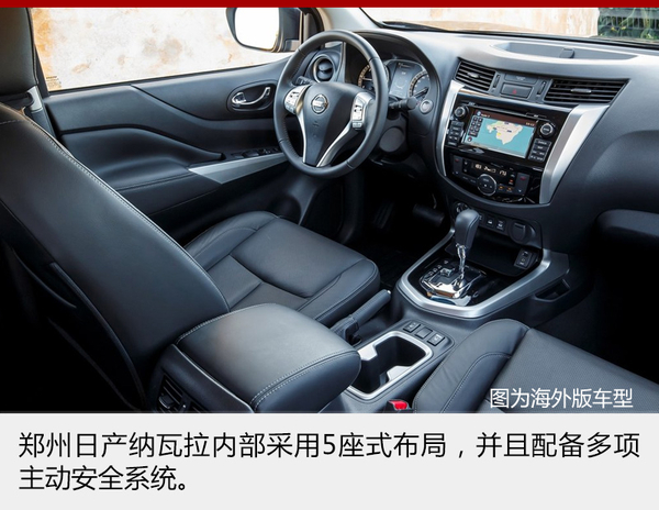 全新纳瓦拉内部采用5座式布局,配备真皮座椅、自动空调、驾驶席8向电动调节以及6扬声器音响。同时,新车还配备有防抱死刹车(ABS)、电子制动力分配(EBD)、制动力辅助(BA)等主动安全系统。