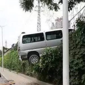 5月6日中午12点左右,河南郑州市二环支路嵩山北路铁路桥东向西,一辆面包车从路面上倒车,车屁股冲出绿化带一半,车身悬空!