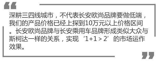 “长安欧尚品牌定位是精耕三四线城市,为三四线城市的年轻消费者提供符合他们需求的产品。”梁光忠话风一转“深耕三四线城市,绝不代表长安欧尚品牌要做低端,你可以看到我们的产品价格已经上探到10万元以上价格区间。长安欧尚品牌与长安乘用车品牌形成类似大众与斯柯达一样的关系,实现‘1+1>2’的市场运作效果。”