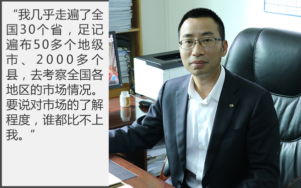 梁光忠每走过一个城市,就要在地图上标记出来,3年时间,地图被画满了。对此,他笑着说道:“我几乎走遍了全国30个省,足记遍布50多个地级市、2000多个县,去考察全国各地区的市场情况。要说对市场的了解程度,谁都比不上我。”梁还说,他不喜欢使用飞机这一最快捷的交通工具,反而喜欢火车、汽车这种慢速的出行方式。“坐在车里,我能够亲眼看到各地区交通情况的差异,哪里山路多?哪里拥堵?从而分析消费者用车需求的不同,如此才能针对市场的需求在产品上进行改进。”