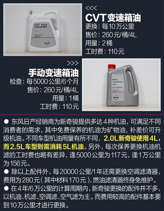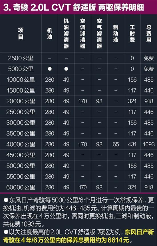 编辑点评:根据保养手册规定,新奇骏每5000公里/6个月就要进行一次常规保养,小保平均450元,大保平均1000元,在同级别中属于中上水平,但受制于较高的保养频次,奇骏在6万公里的保养总费用却并不算低,2.0L车型约需花费6641元,2.5L由于机油用量增加则略微高一点。不过值得一提的是,奇骏的前期保养项目较为简单,基本只有机油、三滤等等,对车主而言比较省心。