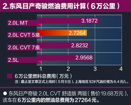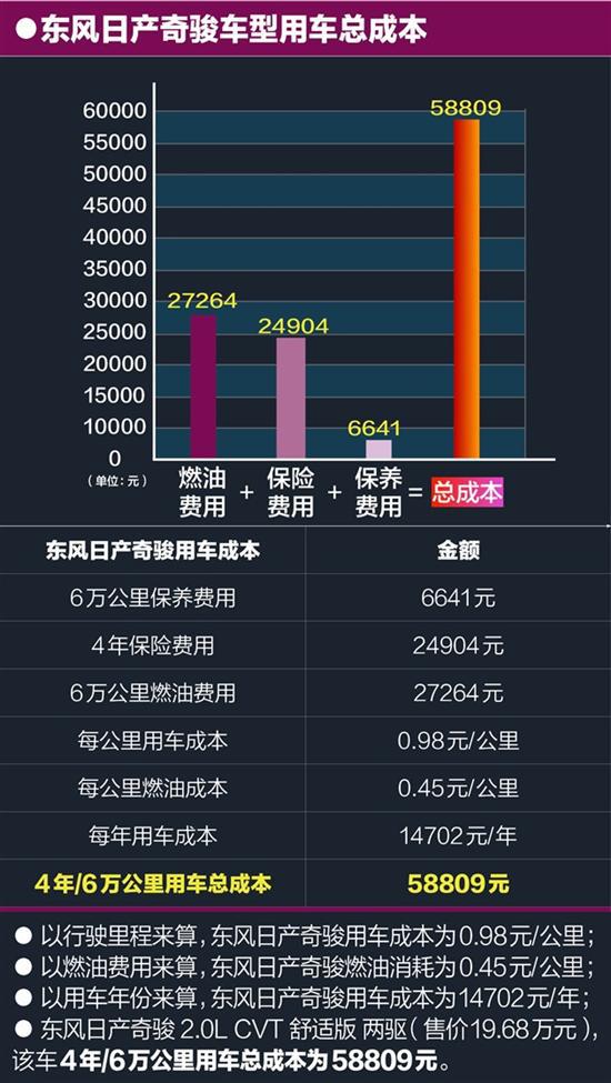 综合来看,东风日产新奇骏在4年/6万公里的用车成本为58809元,平均每公里0.98元。至于新加入的7座车型对养车的负担并不大,唯一的不同便是油耗,百公里多消耗0.2L汽油。如果有二胎计划,编辑认为完全可忽略增加的这一点点用车成本。