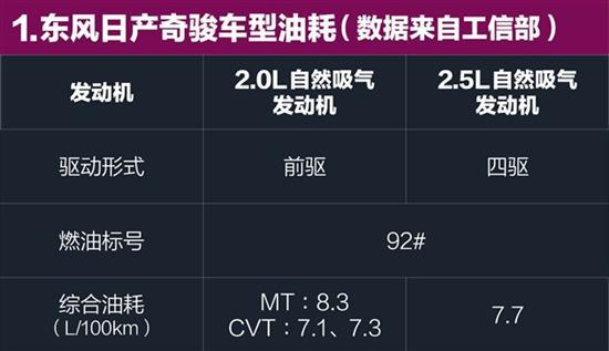 奇骏在动力上选择的仍是自然吸气发动机和CVT变速箱(除2.0L最低配为6速手动),所以相比采用涡轮增压发动机的竞品们,奇骏在油耗方面不会有特别亮眼的表现,但换来的是更平顺的驾驶感受和更放心的养车过程。从官方信息来看,奇骏百公里油耗7.1-8.3L,2.0L 5座CVT车型最实惠,而不带"T"也意味着奇骏全系可使用92号汽油。