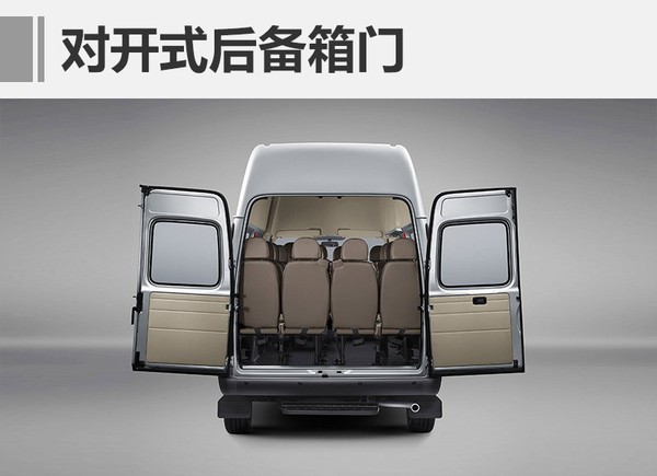在车尾部分,江铃特顺基本维持了经典全顺的造型,尾灯组样式有所变化,更符合现今的审美。对开式尾门更方便货物的搬运,两侧分别贴有“江铃特顺”及“JMC”的文字标识。此外,新车推出多种不同尺寸的车型,包括低顶/中顶/高顶和短轴/长轴的区别,让消费者可根据自身需求更好的选购。