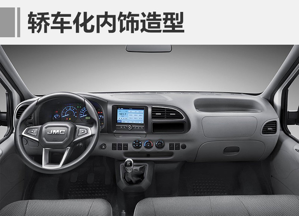 江铃特顺的车头部分在经典全顺的基础上进行了大幅度的修改,换装了带有三横幅镀铬条的梯形大嘴式前进气格栅,灯眉上扬的前大灯非常有神。车头中央放置了JMC品牌LOGO,几根线条的修饰令前脸更加棱角分明。