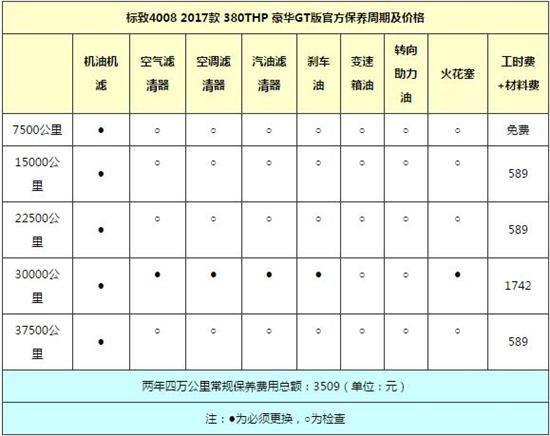 标致4008 2017款 380THP 豪华GT版两年四万公里常规保养支出分析,标致4008 2017款 380THP 豪华GT版目前享受的是三年或10公里的整车质保政策。(由于各地区4S店工时费有差别,所以详细费用请以当地4S店实报价为准,以下仅供大家参考)