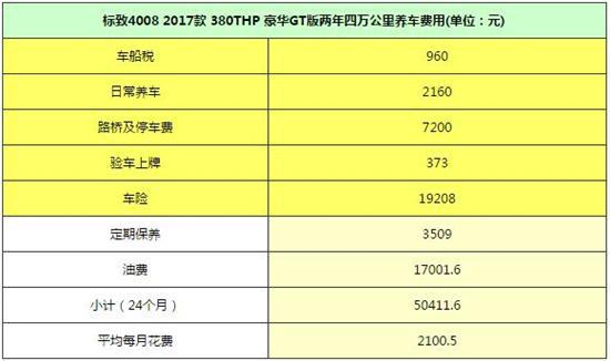 根据养车费用=车船使用税+日常维护费+过路过桥和停车费+上牌费+保险+常规保养费用+油费,标致4008 2017款 380THP 豪华GT版两年4万公里各项养车支出明细如下: